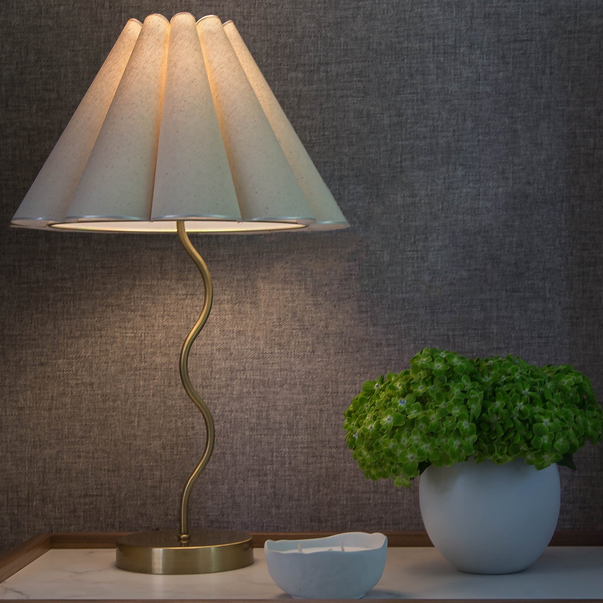 Elevate your space with this sophisticated table lamp, where style meets functionality. Its contemporary design, featuring a platinum base and a sleek shade upholstered in Mother of Jungle fabric, creates a warm, inviting ambiance. The satin gold finish adds a refined touch of elegance. Ideal for illuminating your nightstand, desk, or any corner in need of both light and style.